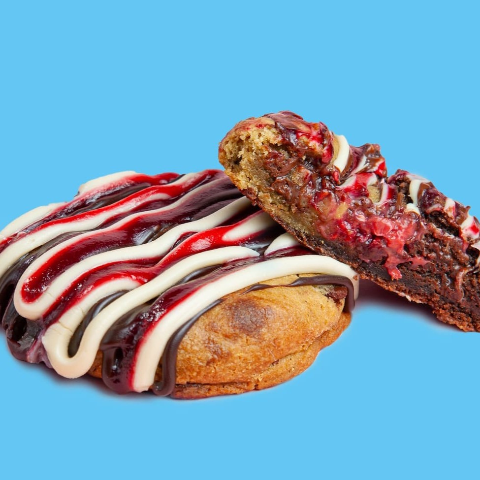 Cookie feito com massa meio a meio, clássica e triplo chocolate. Ele é recheado de framboesa e por cima coberto com chocolate branco, meio amargo e geléia de framboesa.