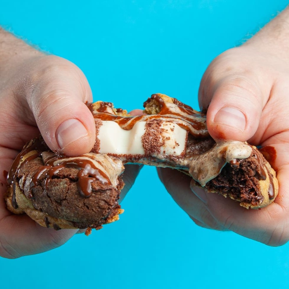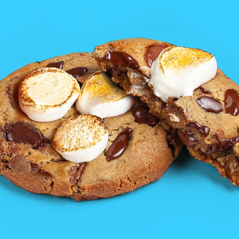 Cookie de 110g recheado de marshmallow! Com massa de baunilha e gotas de chocolate ao leite e meio amargo. Ele é crocante por fora e bem molinho por dentro, chega quentinho na sua casa!