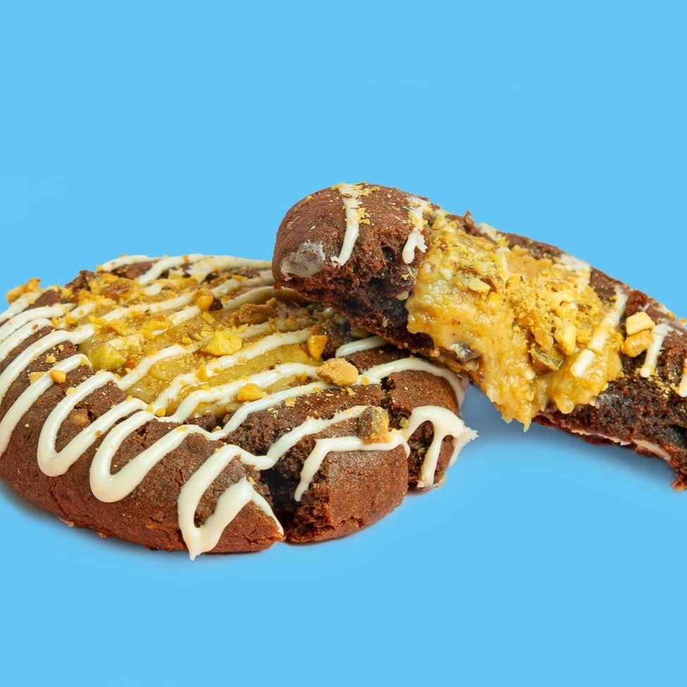 Cookie massa triplo chocolate com recheio de creme de pistache, coberto com chocolate branco e pedacinhos de pistache.