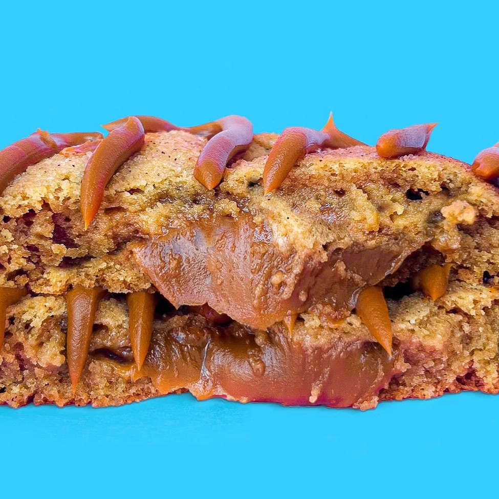 Cookie de 130g recheado de doce de leite! Com massa de baunilha, coberto com uma casquinha crocante de açúcar com canela e finalizado com um doce de leite cremoso por cima. Ele é crocante por fora e bem molinho por dentro, chega quentinho na sua casa!