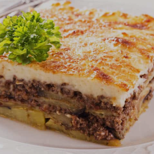 Camadas de berinjela grelhada, carne moída suculenta refogada com tomate e especiarias mediterrâneas, cobertas por um cremoso molho bechamel e gratinadas ao forno até atingir o ponto perfeito. Um clássico grego de sabor rico, aroma envolvente e textura irresistível.