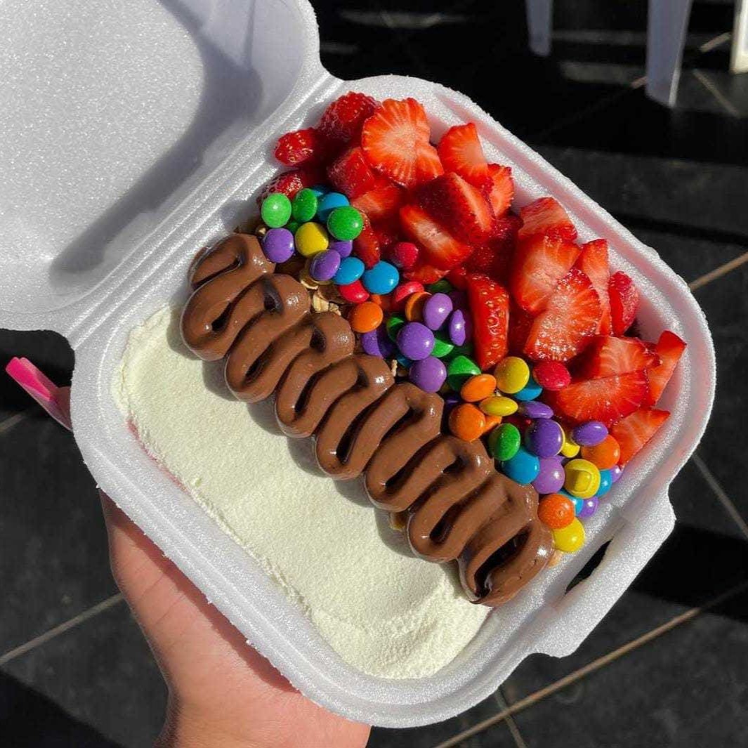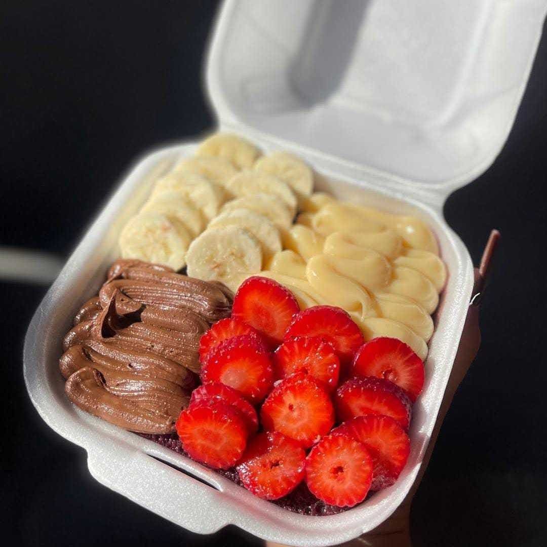Açai Natural, Leite Ninho, Nutella, Confete, e Morangos Frescos.