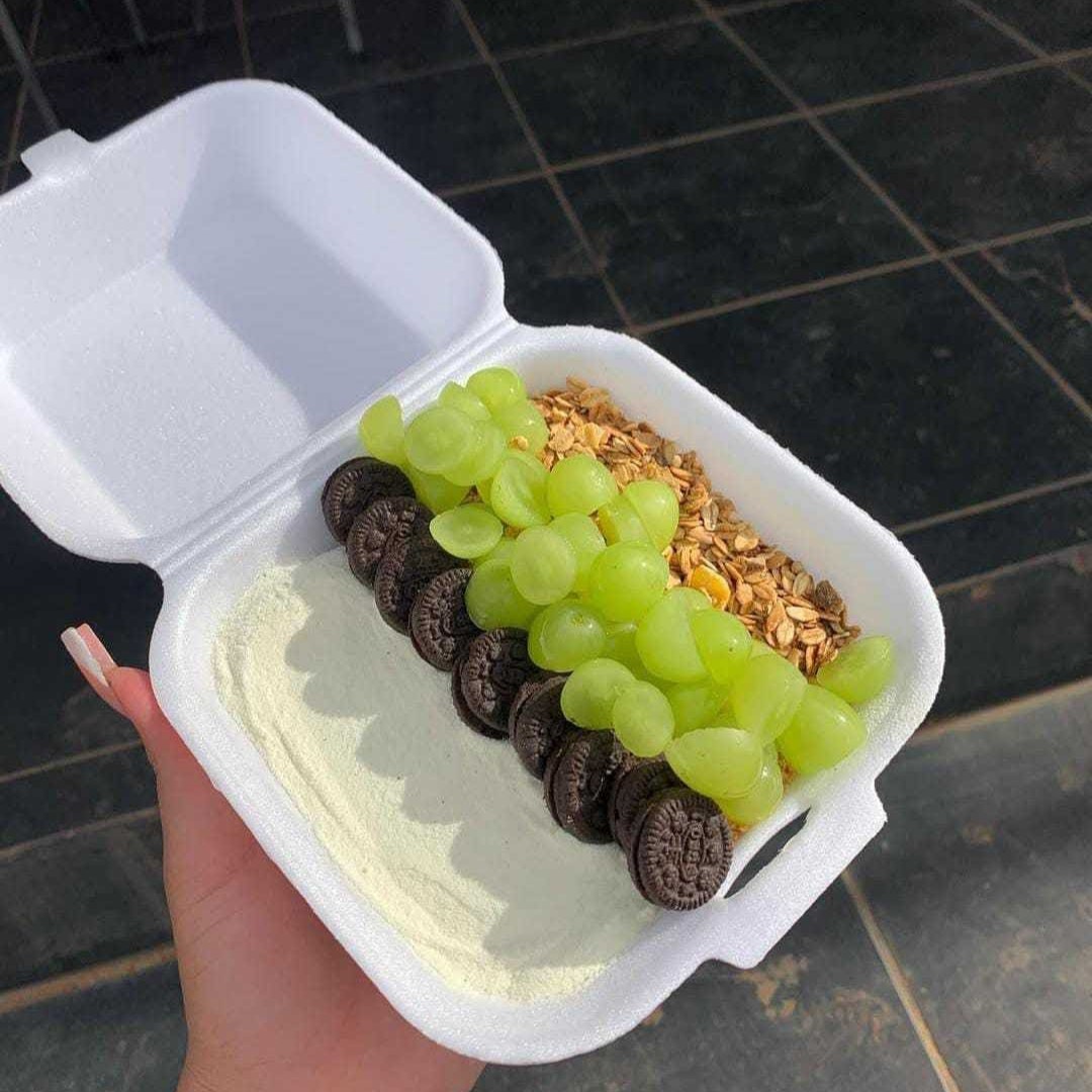 Açai Natural, Leite Ninho, Bisc. Mini Oreo, Uvas Verdes sem Caroço, e Granola.