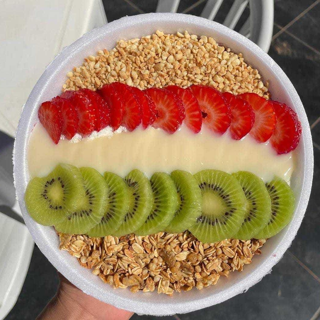 Açai Natural, Amendoim Triturado, Morangos Frescos, Leite Condensado Integral, Kiwi e Granola.