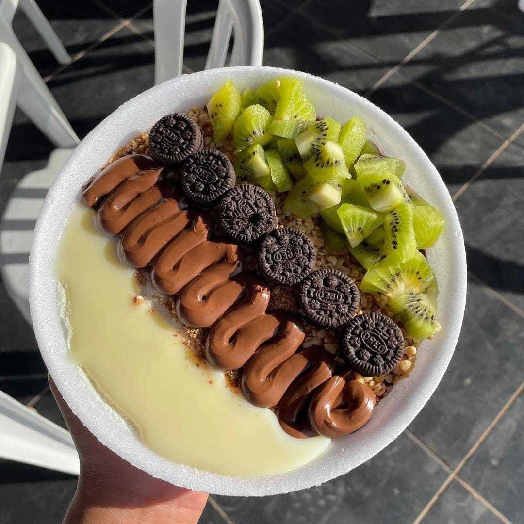 Açai Natural, Leite Condensado Integral, Nutella, Bisc. Mini Oreo, Amendoim Triturado, e Kiwi.