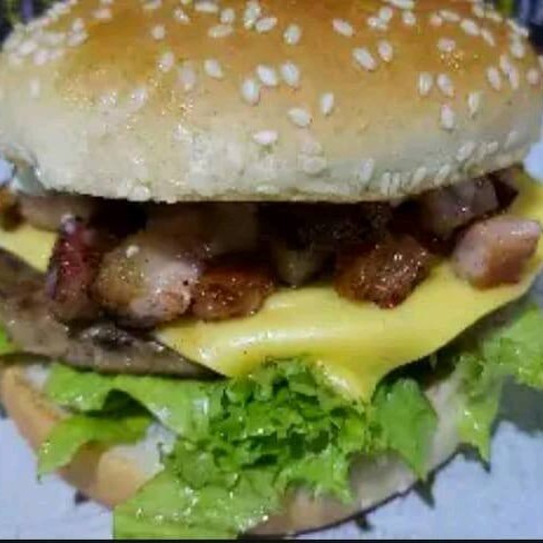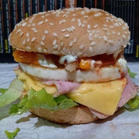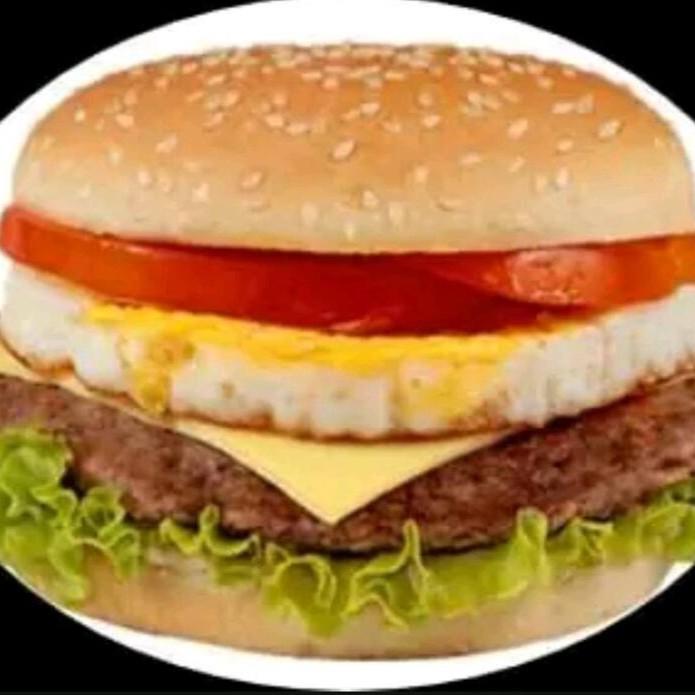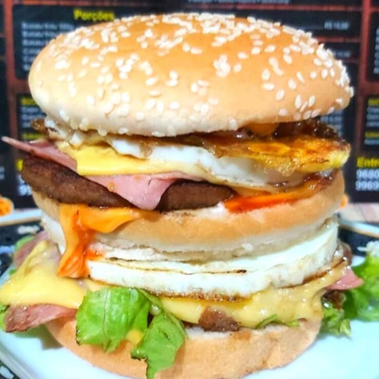Pão , hambúrguer 56gr , bacon , ovo e queijo
