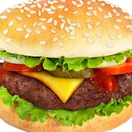 Pão, hambúrguer, queijo bem derretido.