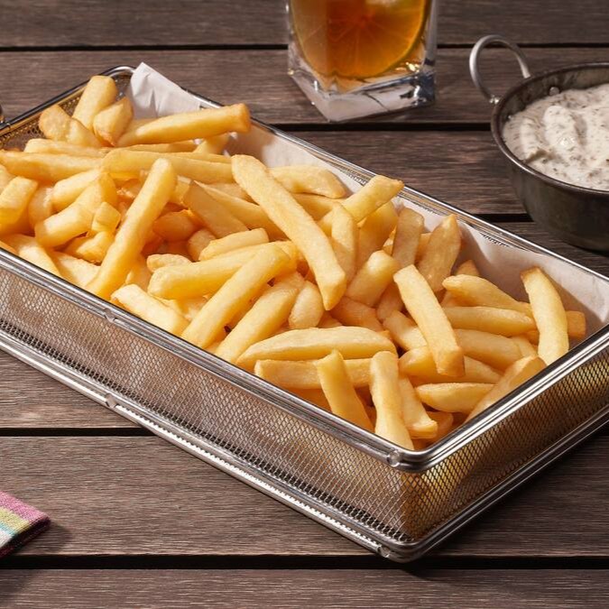 Deliciosa porção de batatas corte fino super crocantes.