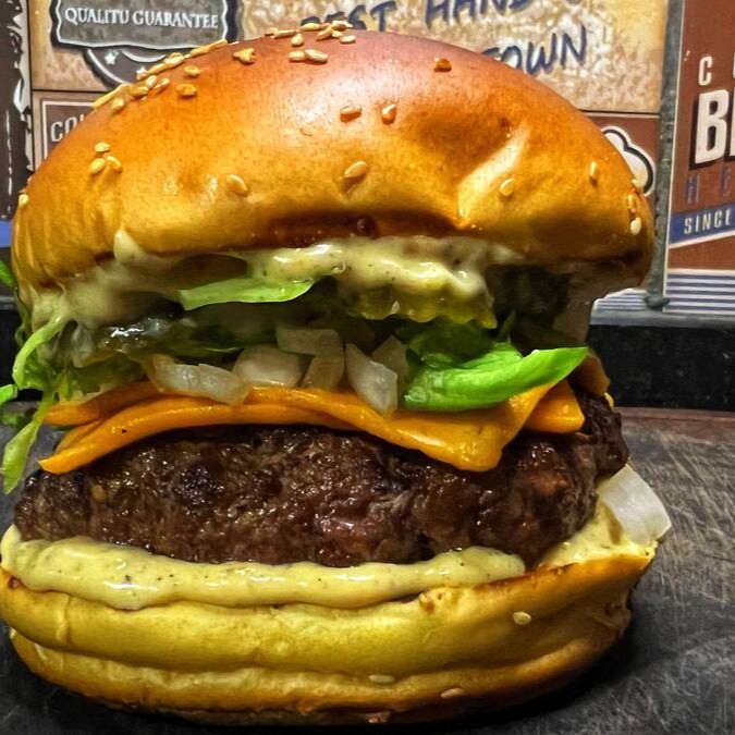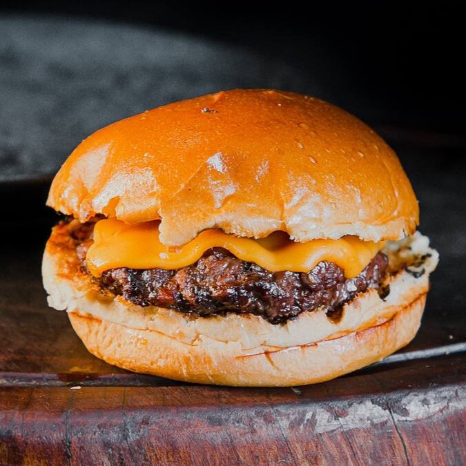 Pão brioche,duas carnes de 90g blend angus,cheddar,alface e maionese da casa.