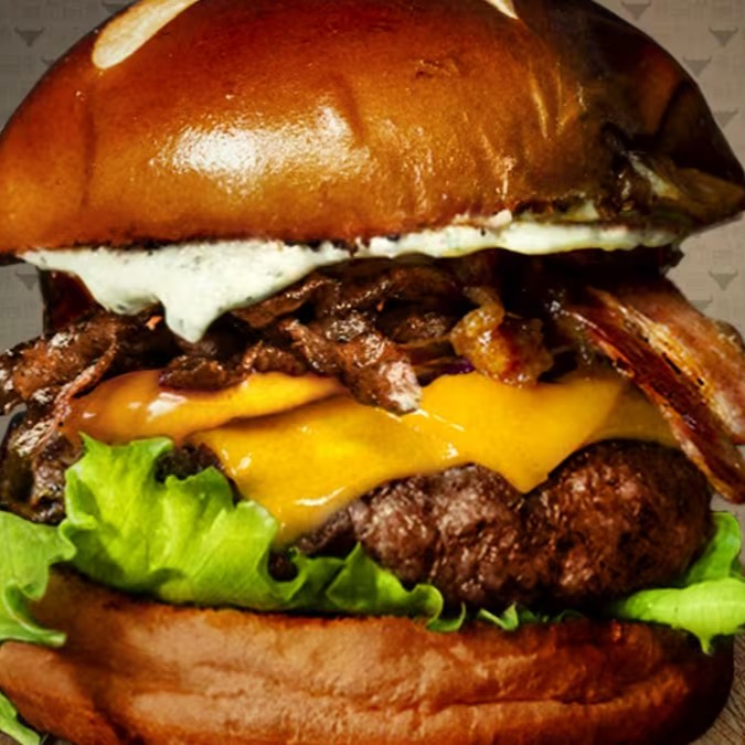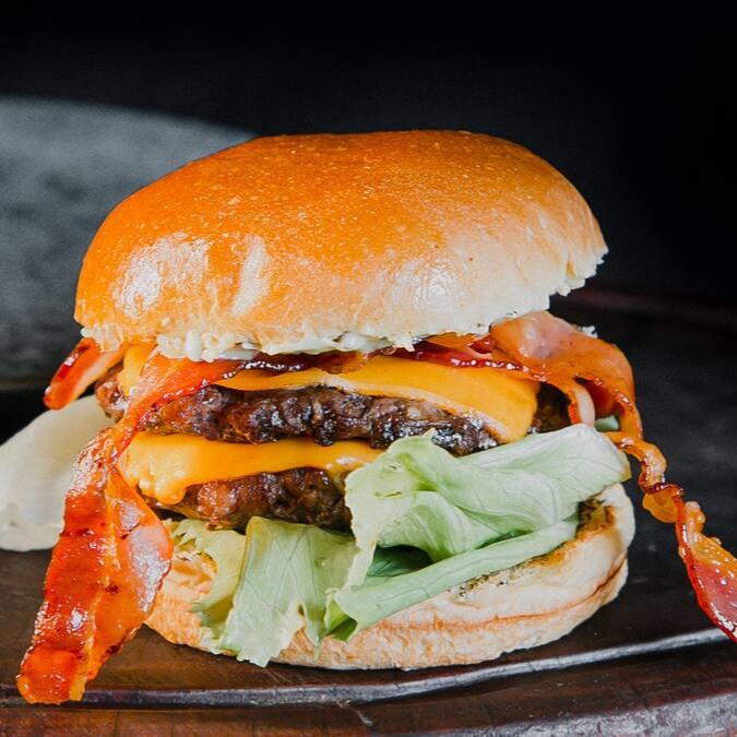 Pão a escolha do cliente, duas carnes 180g de costela Angus, quatro faias de cheddar,bacon crocante,cebola roxa camarelizada,alface e maionese da casa.
