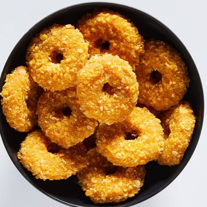 Anéis de cebola pré formados e empanados.