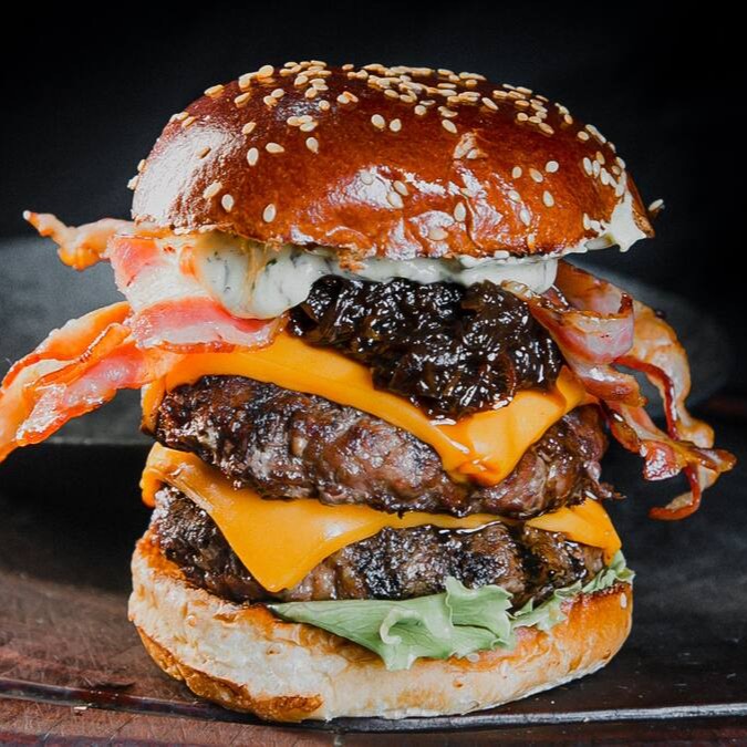 Pão a escolha do cliente, duas carnes de 180g, 4 fatias de cheddar, bacon em dobro, barbecue, cebola roxa caramelizada, alface e maionese caseira.