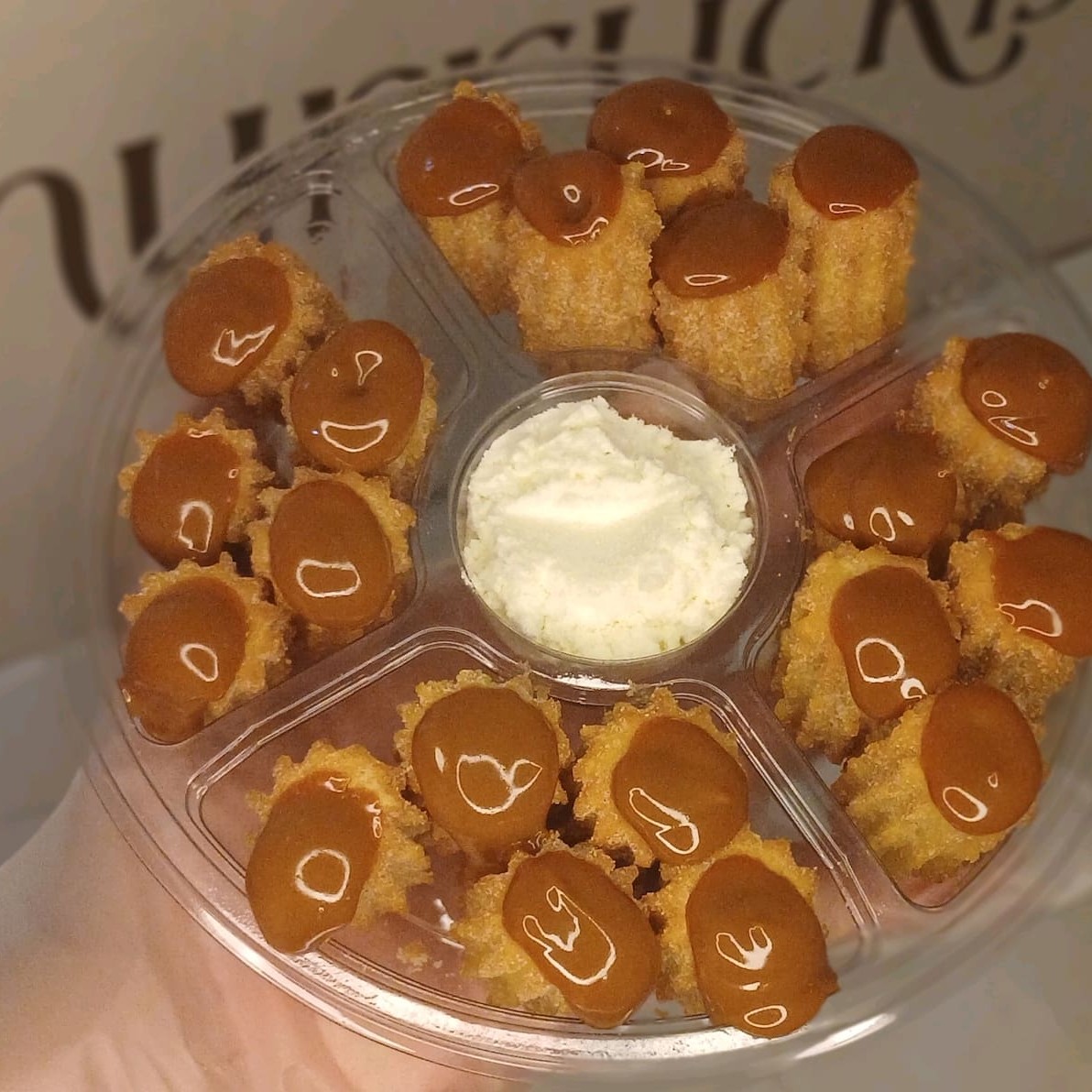 30 unidades de mini churros espanhol sem furo com açúcar e canela acompanha •60ml de doce de sua escolha •Mais confeito de sua escolha