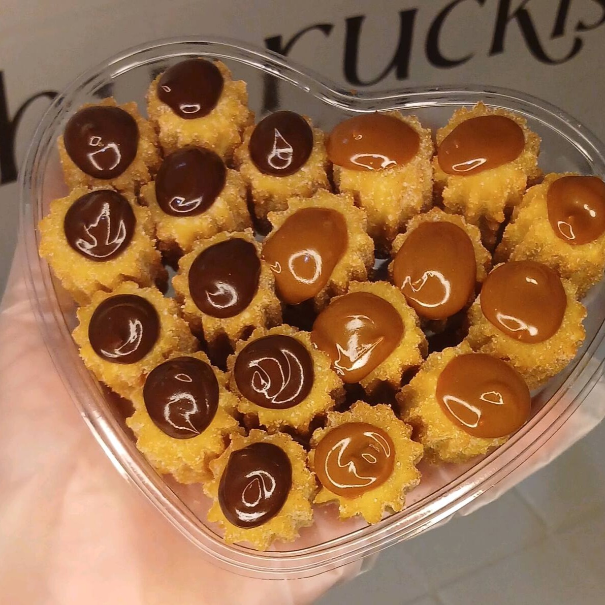18 unidades de mini churros tradicionais na bandeja formato coração com açúcar e canela •Doce de sua escolha •Mais 1 confeito de sua escolha