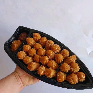 26 unidade de mini churros tradicional com furo com açúcar e canela acompanha •Doce de sua escolha •Mais 1 confeito de sua escolha