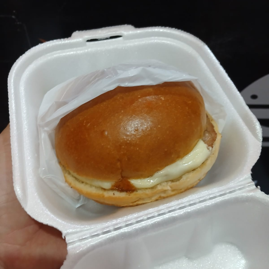 Pão, hambúrguer, queijo, ketchup.