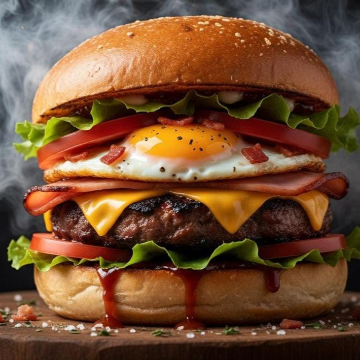Pão, blend 180g 100% bovino, queijo muçarela, presunto, ovo, bacon em cubos, alface, tomate, ketchup e maionese da casa.