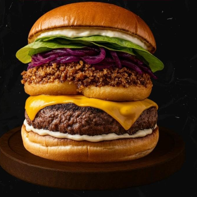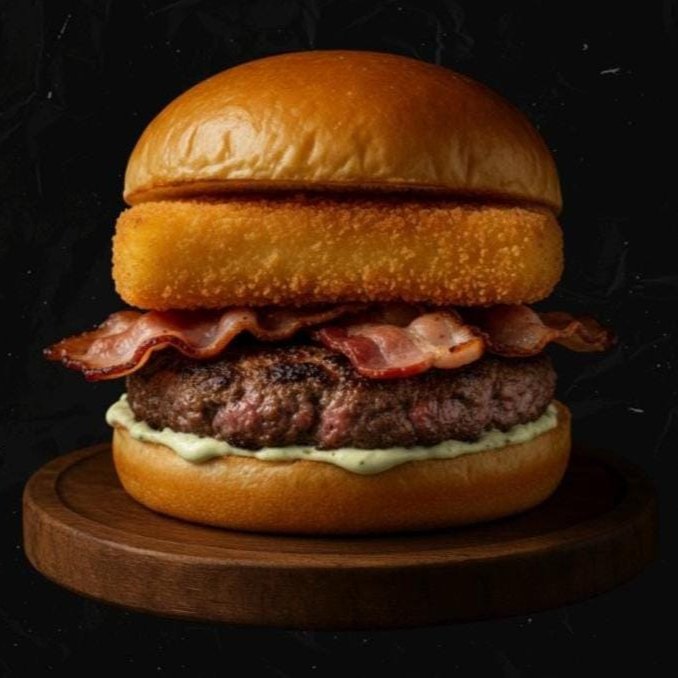 Pão, blend 100% bovino, creme de cheddar, bacon em fatias, cebola Crispy e maionese artesanal.