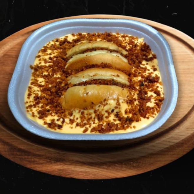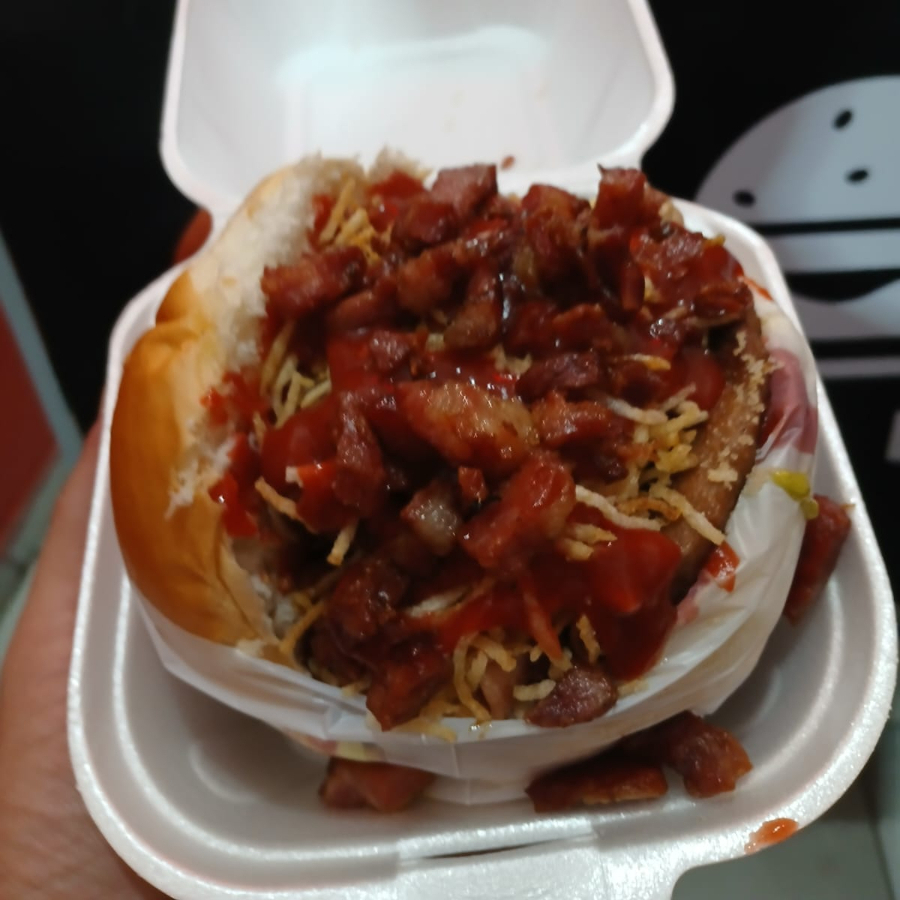Pão, blend 100% bolvino, uma generosa piscina de creme de cheddar Polenghi, farofa de bacon e maionese artesanal. Servido na vasilha de isopor, cortado ao meio.