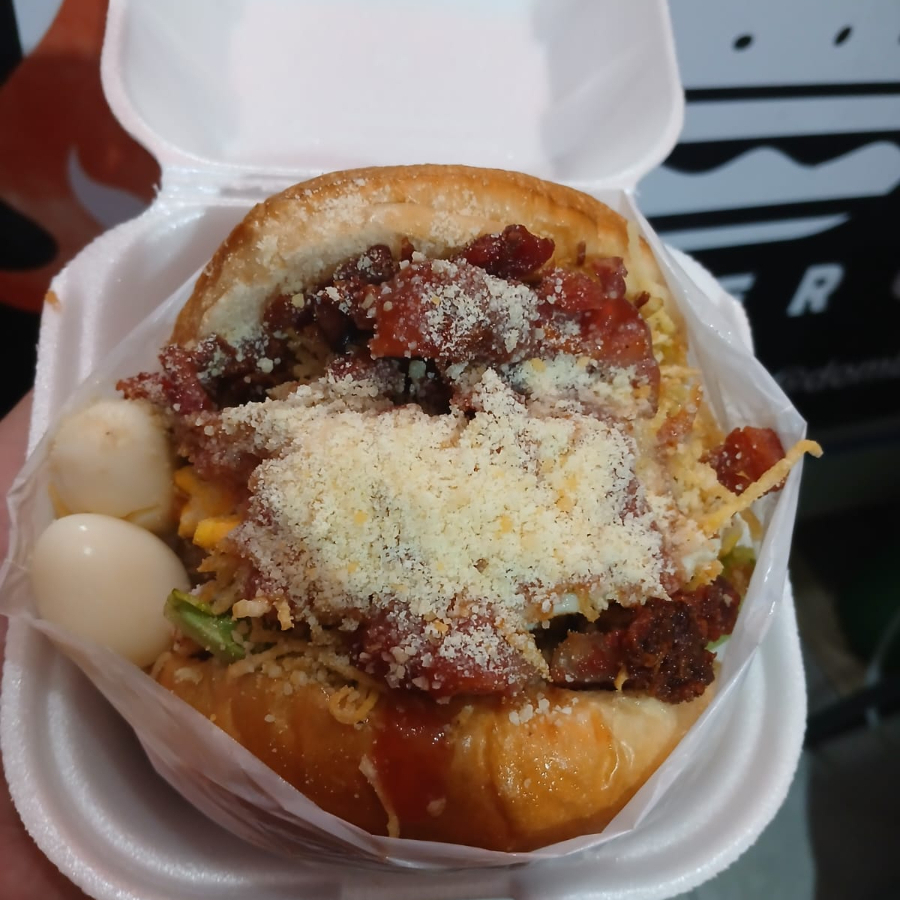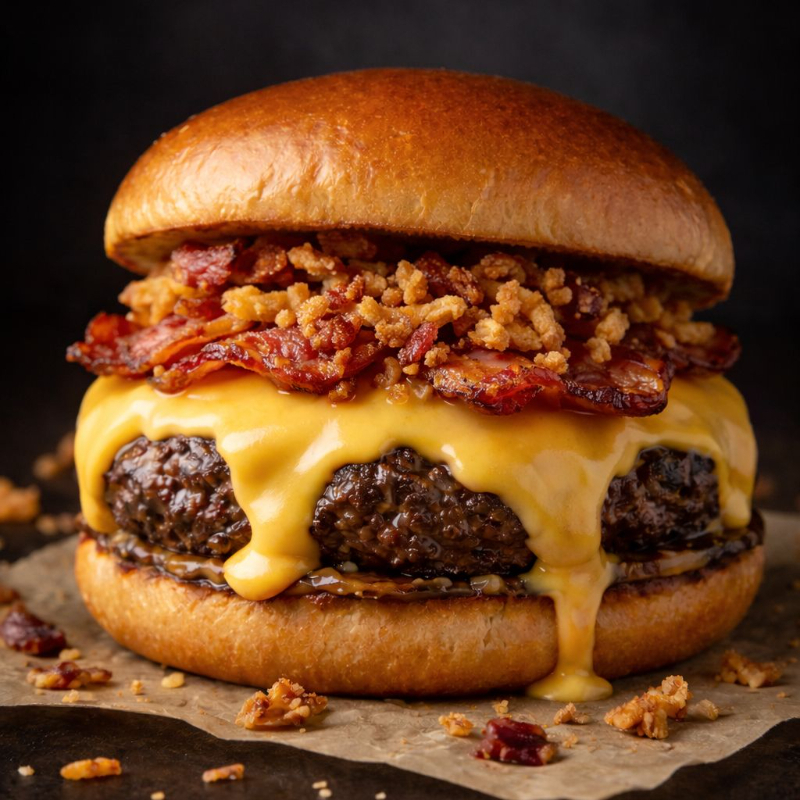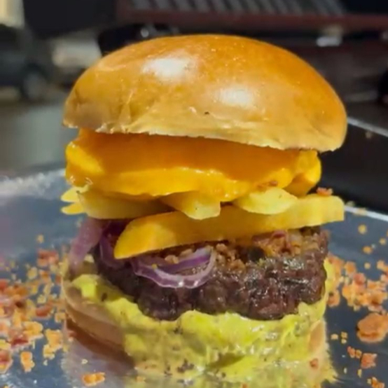 Pão, blend 100% bovino recheado com batata frita, irresistível creme de cheddar Polenghi, farofa de bacon, cebola roxa fresca e maionese artesanal.