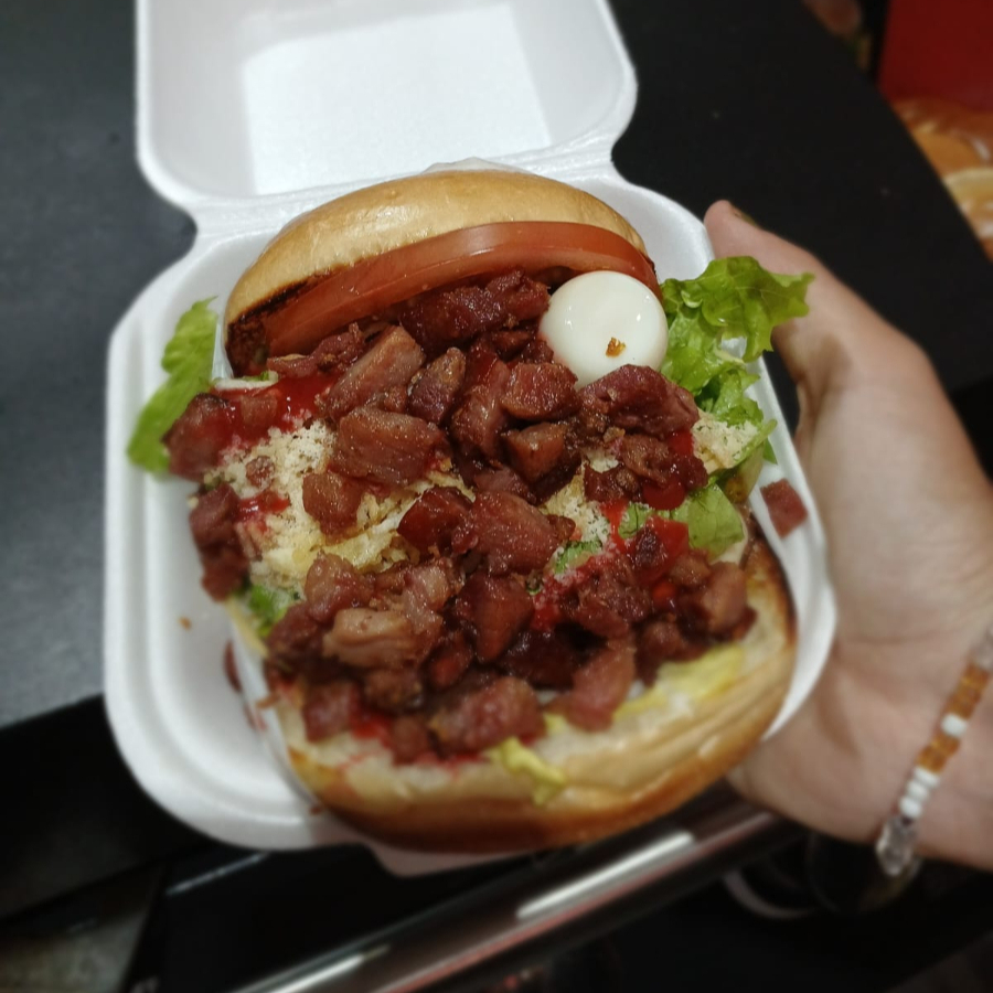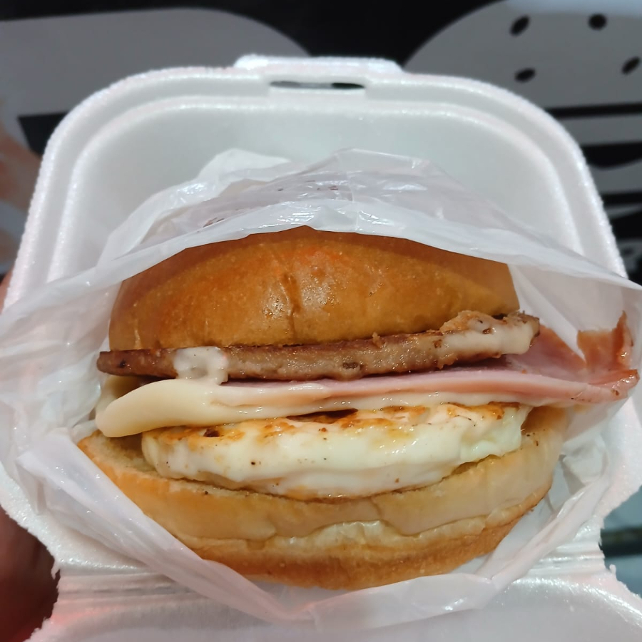 Pão, hambúrguer, queijo, presunto, ovo, ketchup e maionese artesanal.