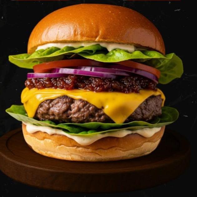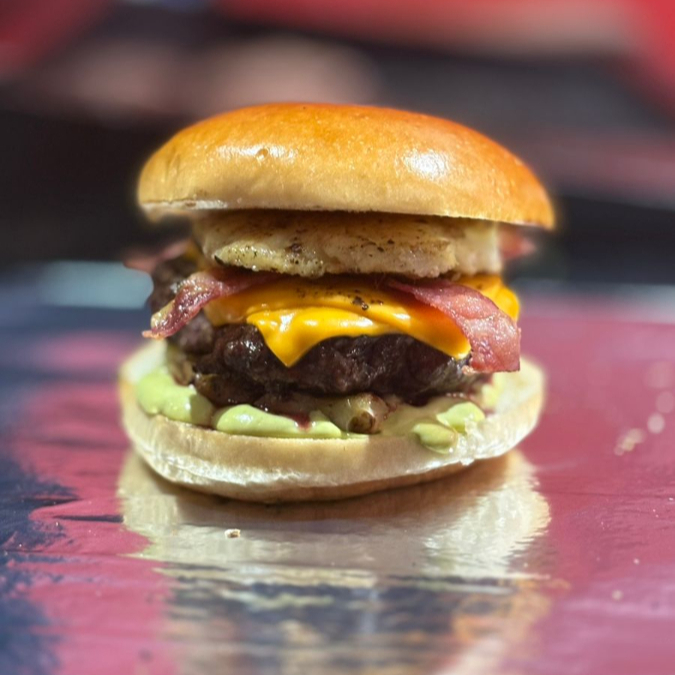 Hambúrguer 100% costela, fatias de cheddar Polenghi, geleia de bacon, cebola roxa caramelizada, alface e maionese artesanal.