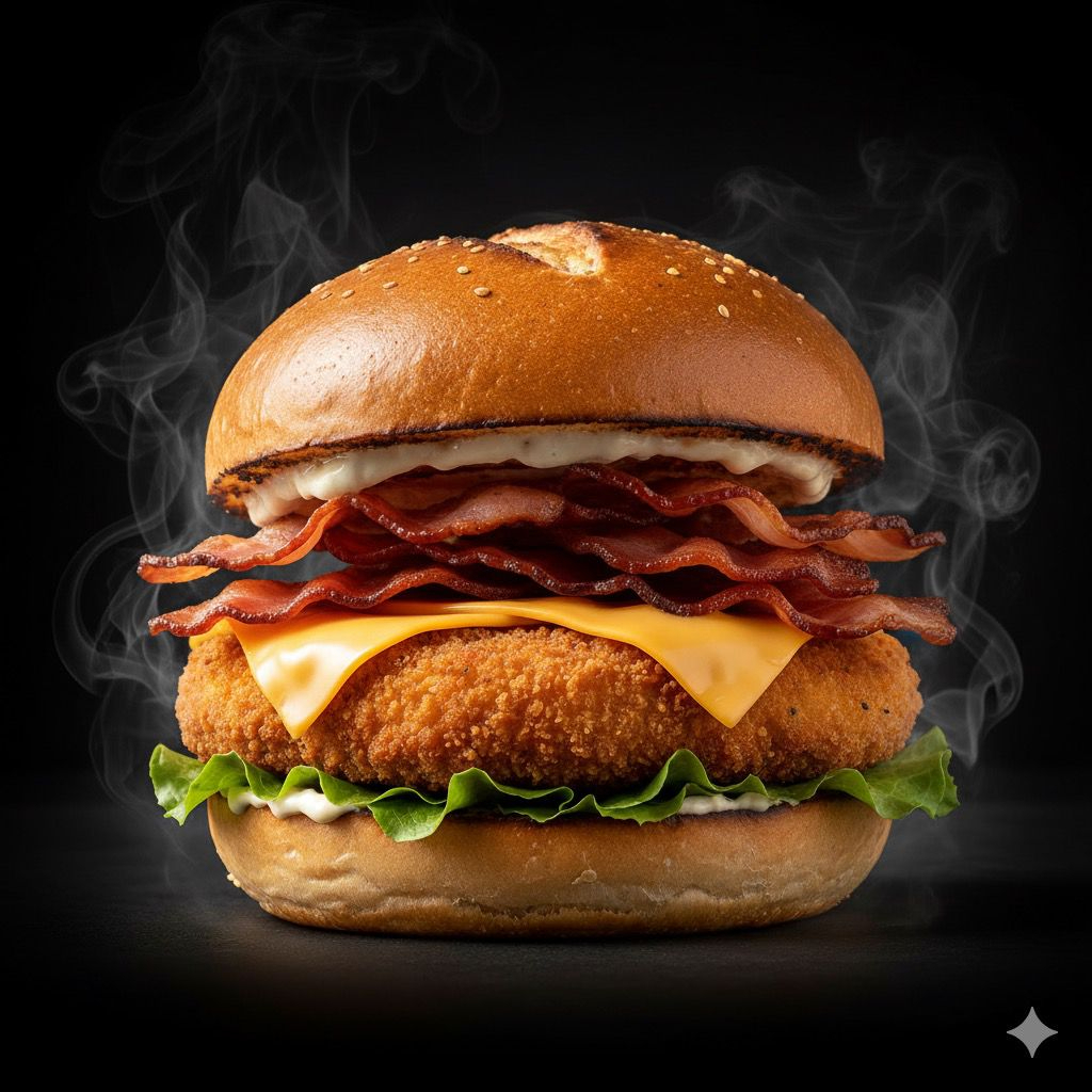 Pão, hambúrguer 100% frango empanado, fatias de queijo cheddar, bacon em fatias, alface e maionese da casa.