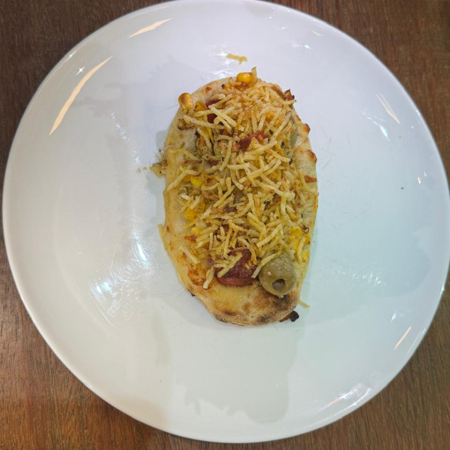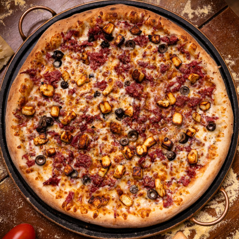 Mussarela, Carne Seca, Queijo Coalho, Azeitona preta e Orégano