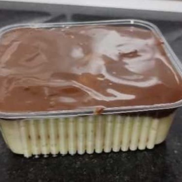 Creme branco , biscoito de maisena molhadinho finalizado com creme de chocolate 50 % cacau .