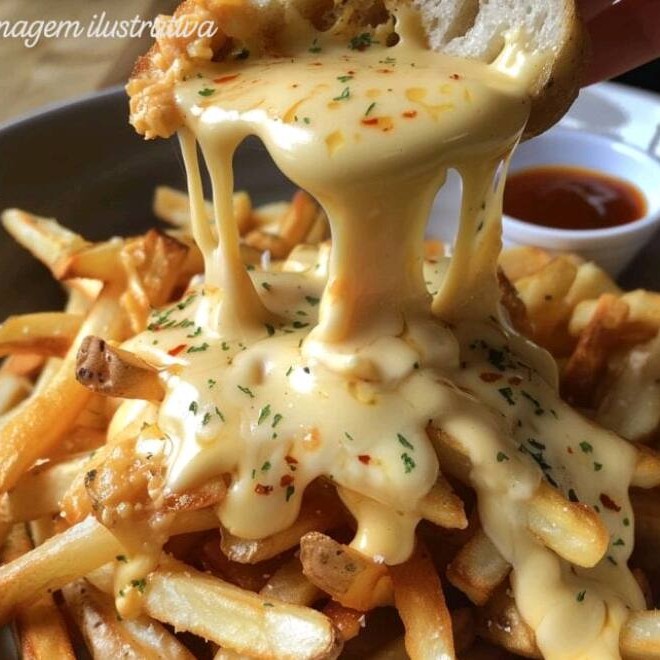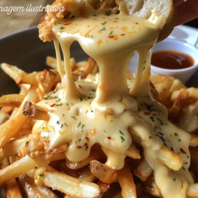 Deliciosas fritas crocantes cobertas com queijo derretido e um molho especial, perfeitas para um lanche saboroso e indulgente.