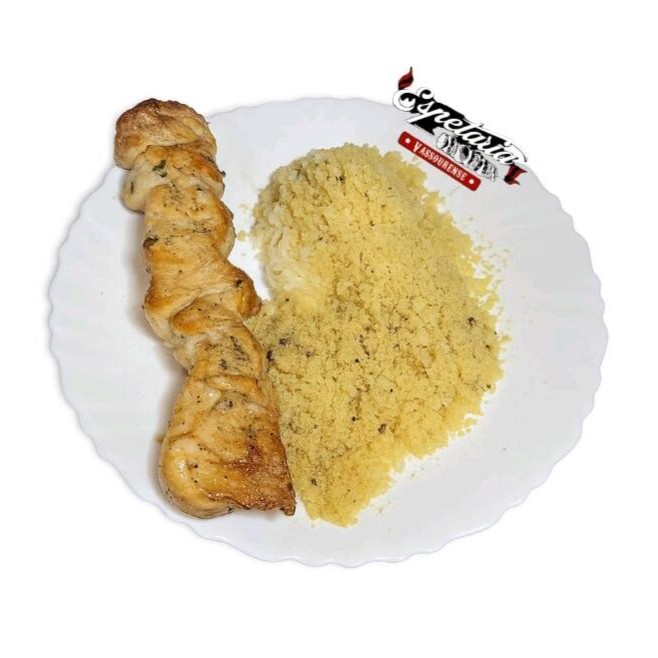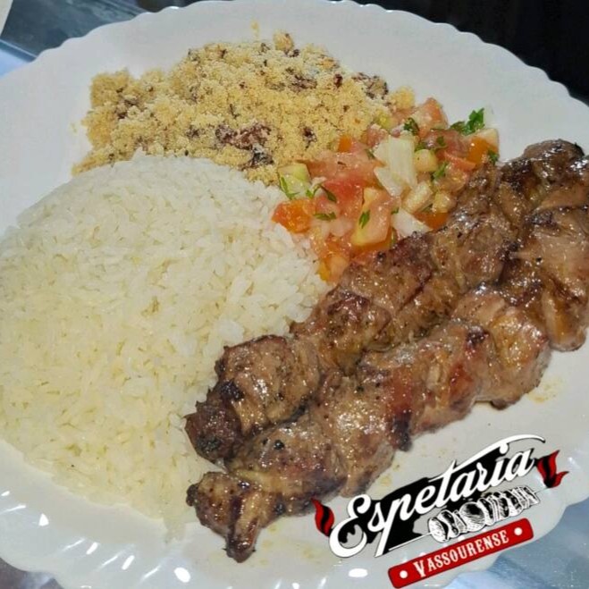 Acompanha; Arroz, Feijão, Vinagrete e Farofa e um Espetinho.