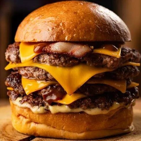Pão brioche, 3x hamb. Acém c/ peito (450gr), 3x cheddar, maionese da casa