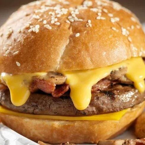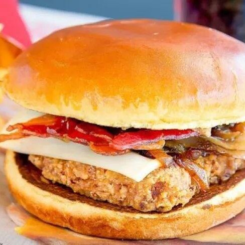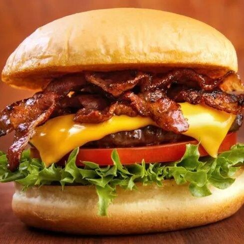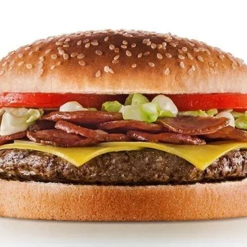 Experimente o sabor inigualável do Cheese-Bacon, com pão de gergelim, hambúrguer de acém com peito 100 gramas, queijo derretido e bacon crocante. Uma explosão de sabores.