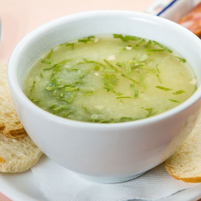 Caldo verde feito com batata, bacon, calabresa e couve picadinha, acompanha torradinha e queijo ralado, aproximadamente 500g.