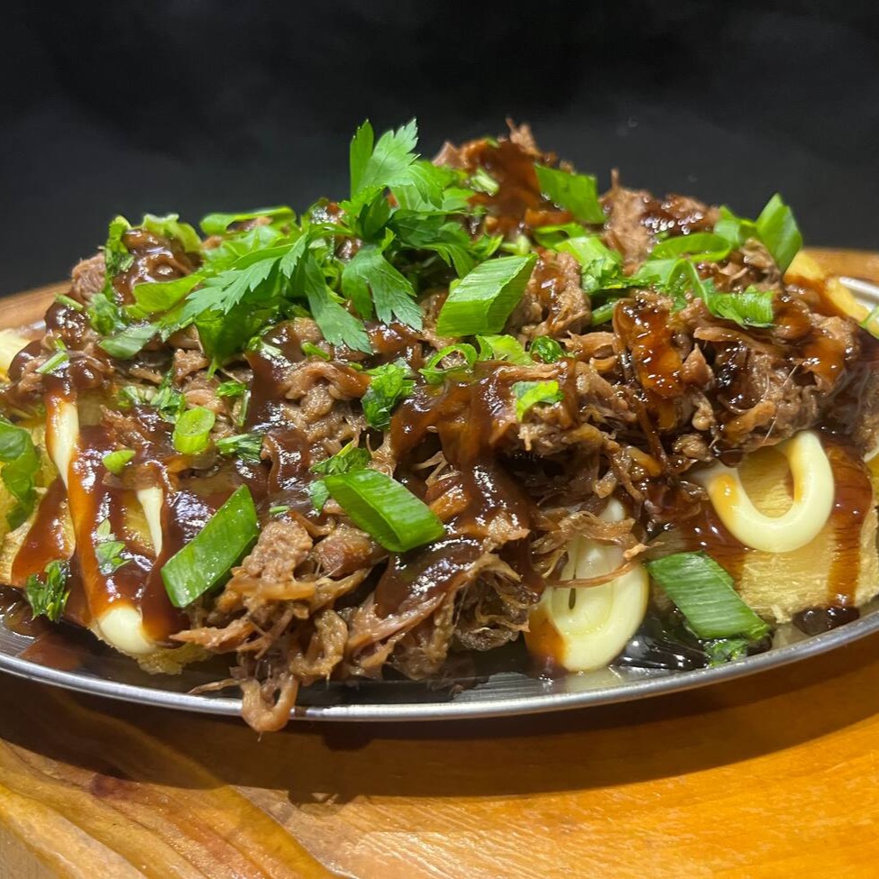 Aipim frito grande, cream cheese, molho barbecue, costela desfiada, salsinha, cebolinha e maionese artesanal