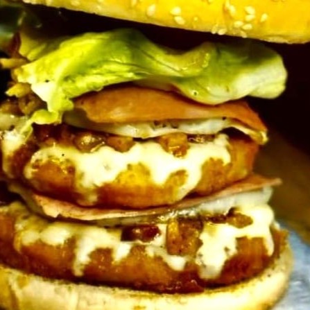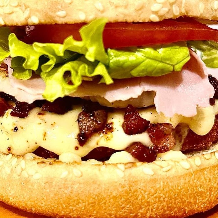 Pão gergelim grande, carne, queijo, bacon, presunto, ovo, batata palha, salada e maionese artesanal.