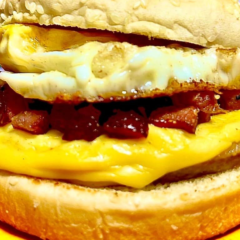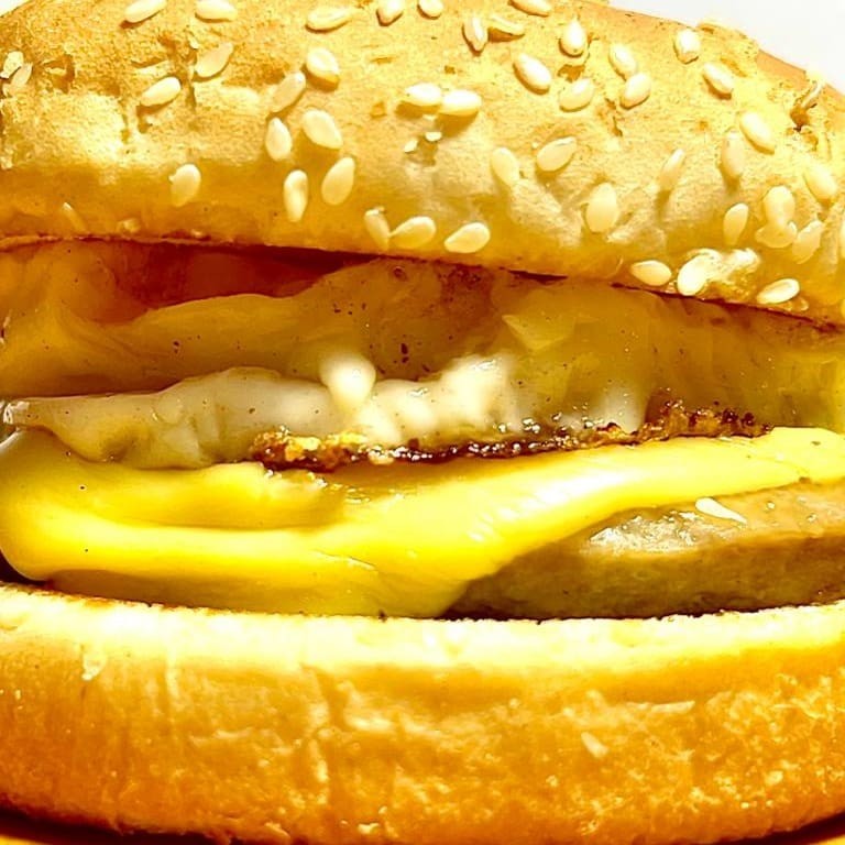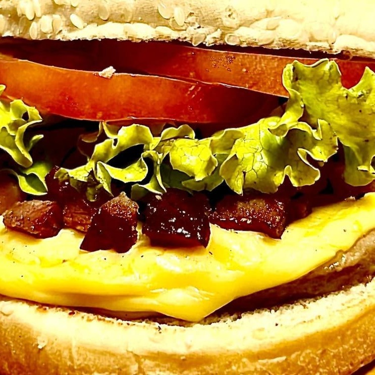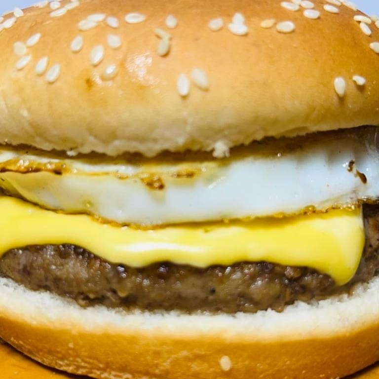 Pão de Gergelim G, carne, ovo e queijo.