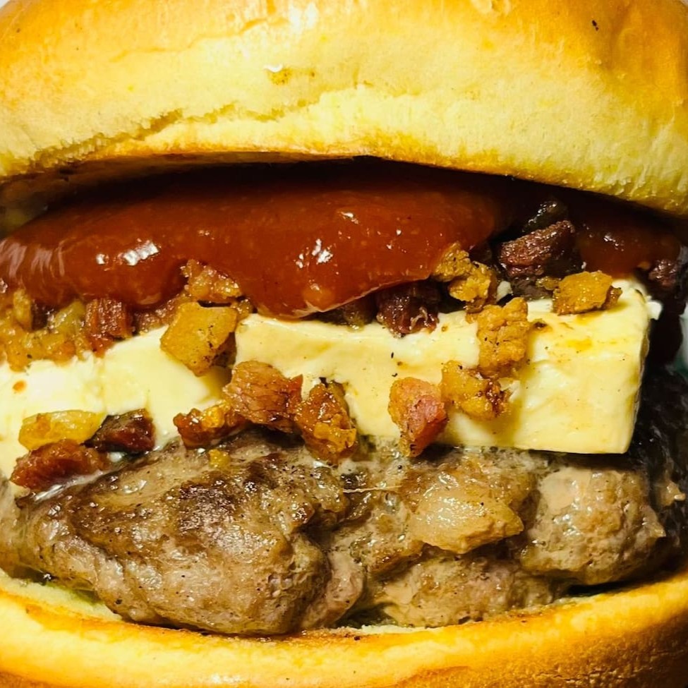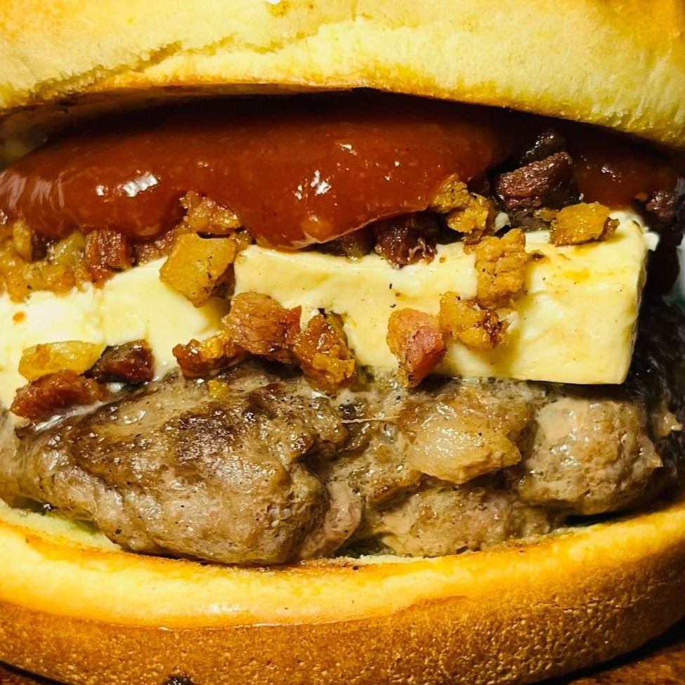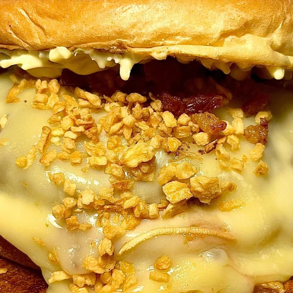 Pão brioche, blend 120g, queijo minas padrão, creme de alho com parmesão, alho torrado farofa de bacon e maionese artesanal.