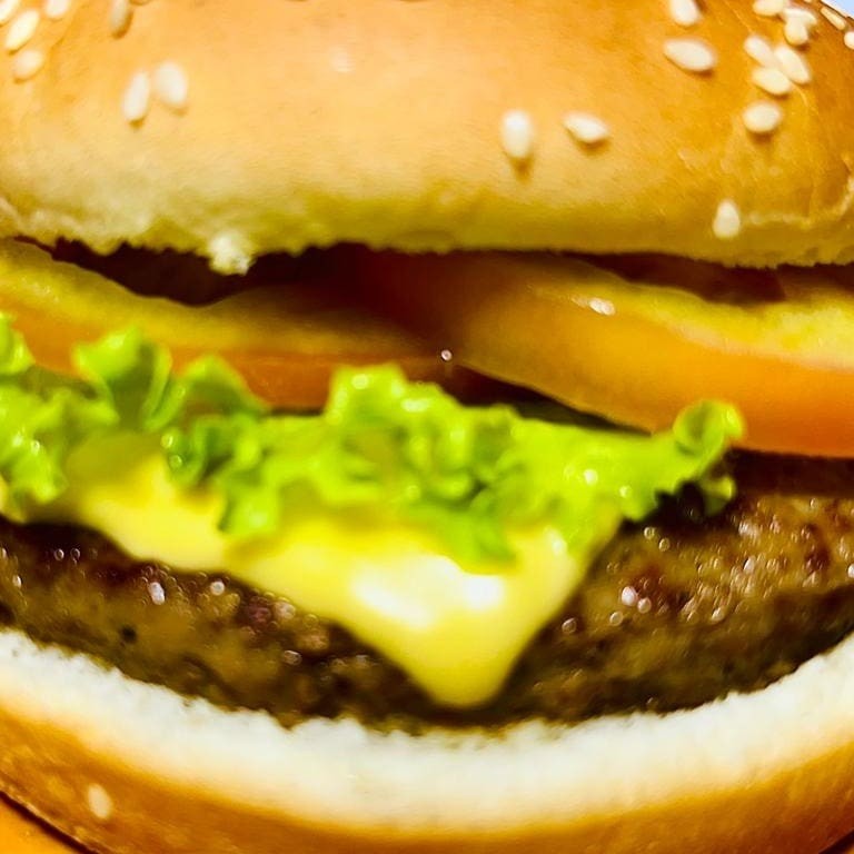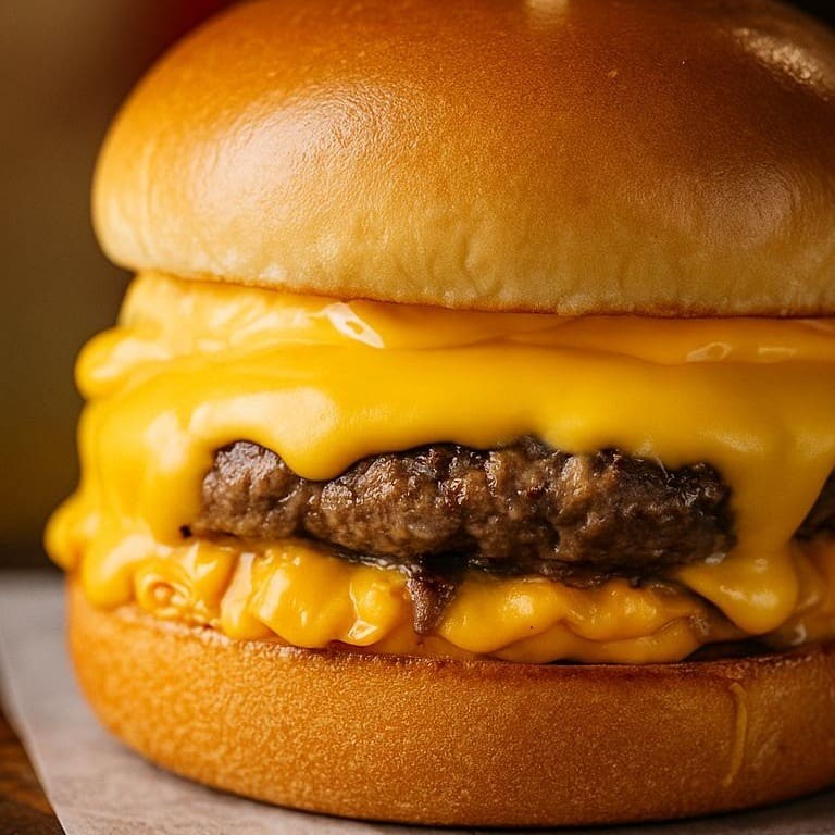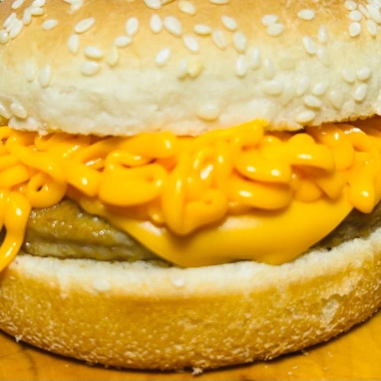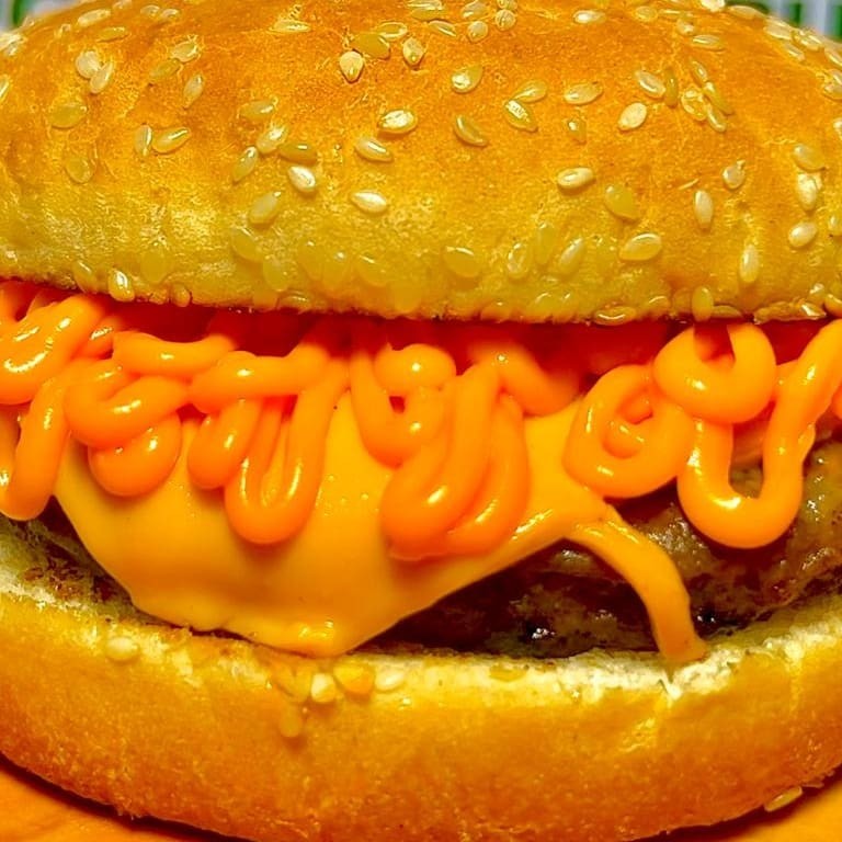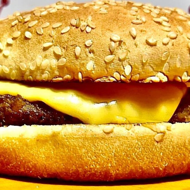 Pão de Gergelim G, carne, cheddar fatiado e cheddar cremoso.