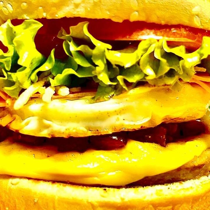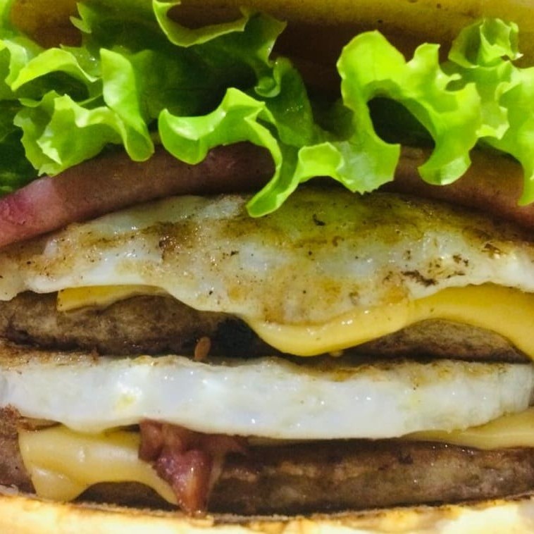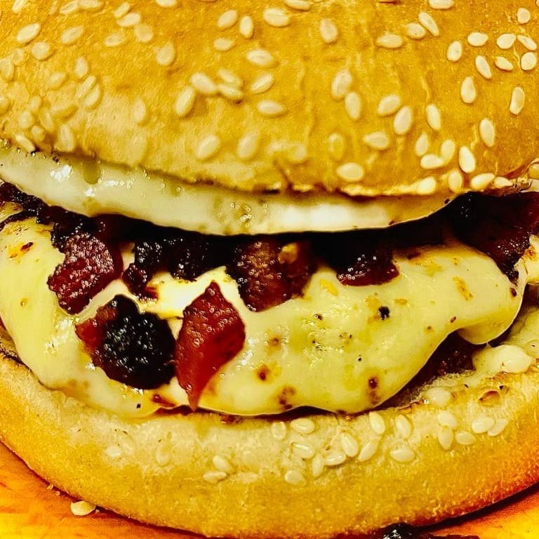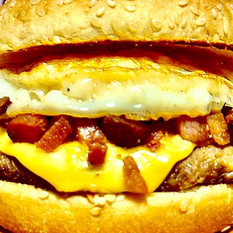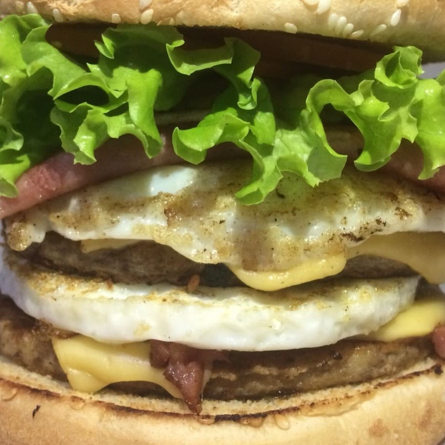 Pão de gergelim grande, carne, queijo, ovo, bacon e maionese artesanal.