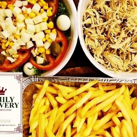 Frango desfiado, batata frita 7mm, alface, tomate, milho, azeitona, palmito, ovo de codorna e maionese artesanal.