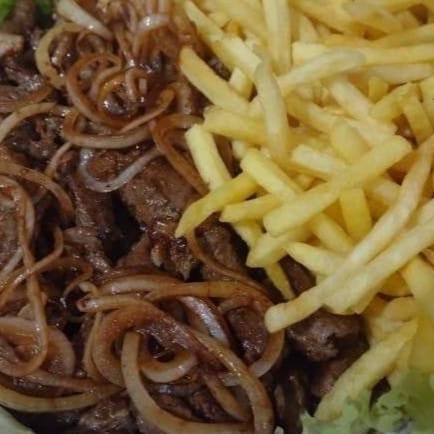 Contra filé, batata frita 7mm, cebola e maionese artesanal