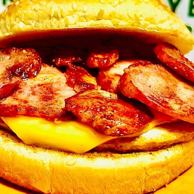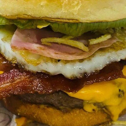 Pão brioche, blend de 120g, bacon fatiado, Batata palha, ovo, presunto, queijo cheddar, alface americana, tomate, molho especial e maionese artesanal.