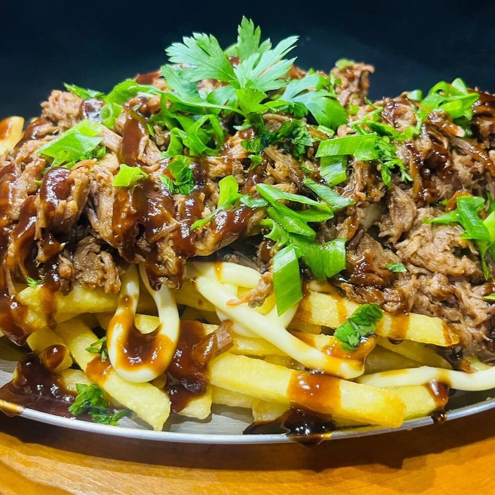 Aipim frito média, cream cheese, molho barbecue, costela desfiada, salsinha, cebolinha e maionese artesanal