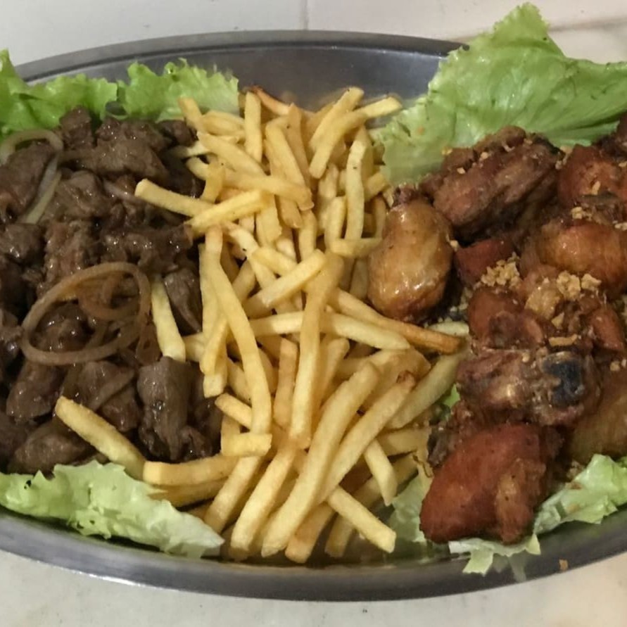 Contra filé 400g, batata frita 7mm 400g, frango a passarinho 400g aproximadamente e refrigerante 1,5 L.