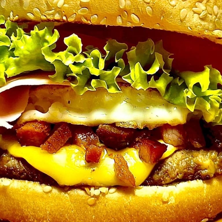 Pão gergelim grande, dupla carne, duplo queijo, duplo bacon, duplo ovo, duplo presunto, salada, batata palha e maionese artesanal.