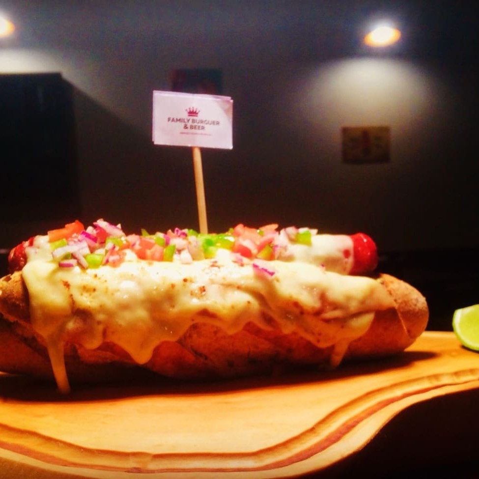 Pão rústico, creme de alho com parmesão, linguiça suína fina artesanal, mussarela, vinagrete e maionese artesanal.