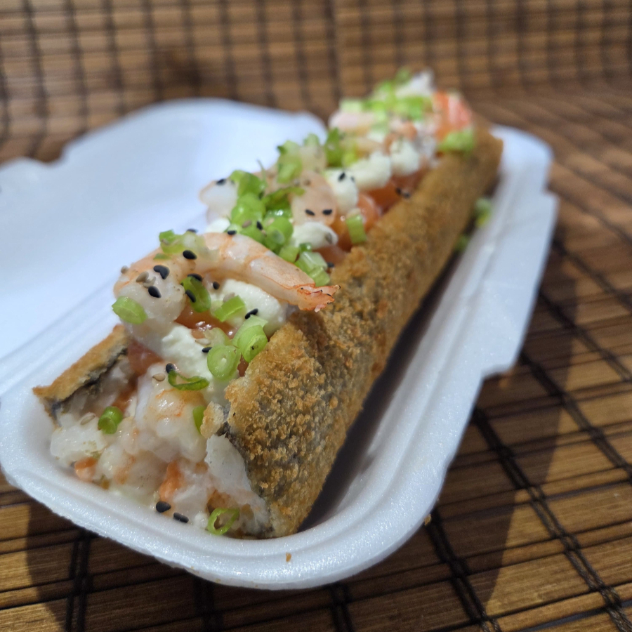Delicioso arroz temperado empanado cortado ao meio, pedaços de salmão e camarão, couve crispy, cebola roxa fatiada, cream cheese e cebolinha pra finalizar.
