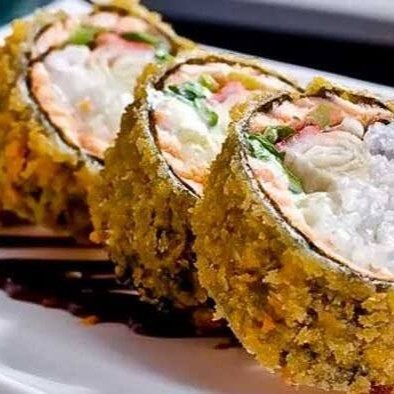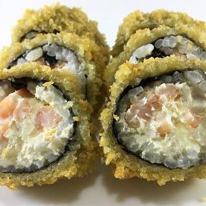 Delicioso arroz temperado empanado cortado ao meio, pedaços de salmão e camarão, couve crispy, cebola roxa fatiada, cream cheese e cebolinha pra finalizar.