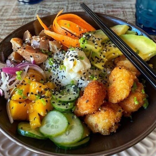 Arroz, Cream Cheese, Cebolinha, Salmão e Camarão Picados, Batata Doce Crispy, Couve Crispy, Manga, Tomate Cereja e Cebola Roxa